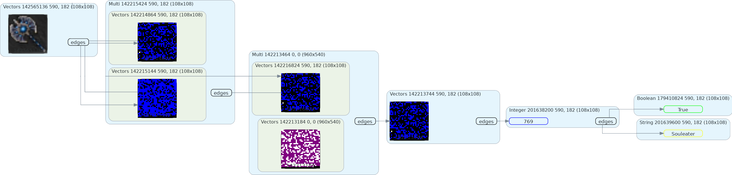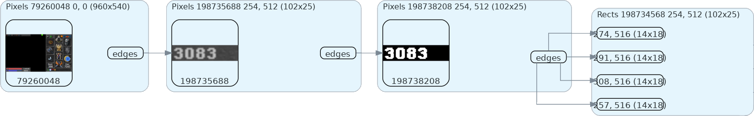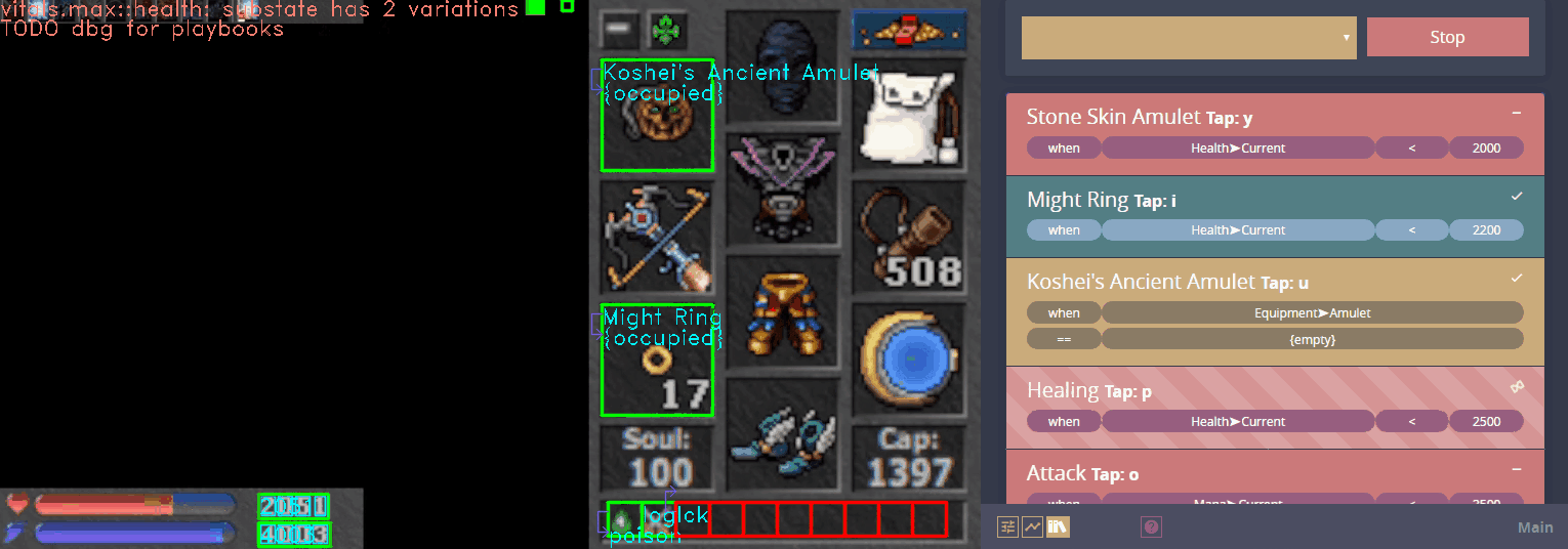 In future posts, I'll talk about all of the parts of the system. But, for now, I hope you enjoyed this look at my vision engine. As a parting gift, here is a clip of the bot in action. It is using an overlay to render information about the perception tree for each frame while following some user-defined rules at 20 frames per second.